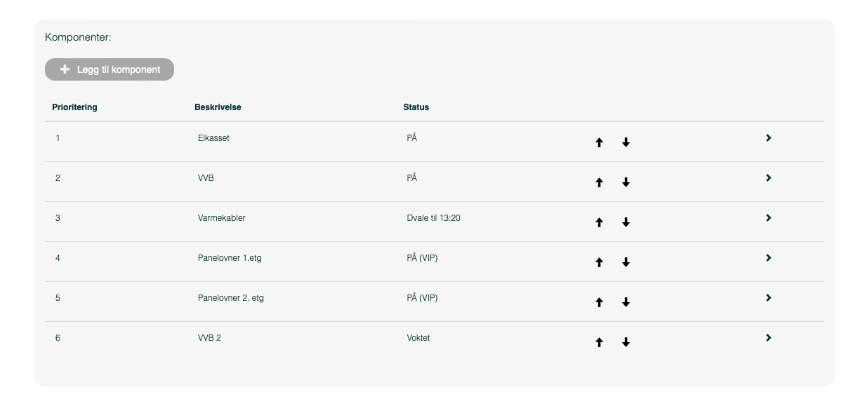 Information about the loads in the facility. Consumption, available capacity and status of the components controlled by Priority.